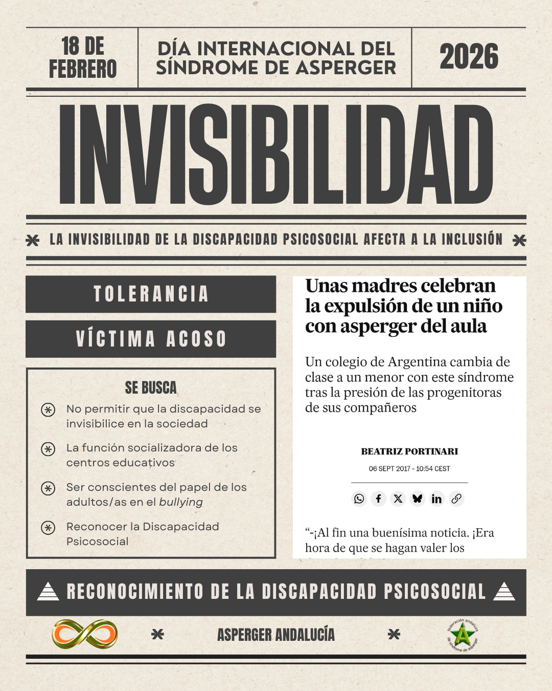 Este año han participado Álvaro Muñoz y Sonia Sánchez que han contado sus experiencias en torno al acoso escolar, y cómo éstas han influido a lo largo de sus vidas. El acto ha tenido como eje la visibilización del acoso escolar en el colectivo, y ha contado con las intervenciones de D. Pere Calbó, Director General de Personas con Discaoacidad, de D. Jesús Aguirre, Presidente del Parlamento de Andalucía, y de D. Rafael Jorreto, Presidente de Asperger Andalucía, que leyó el manifiesto elaborado para este día por la Confederación Asperger España.